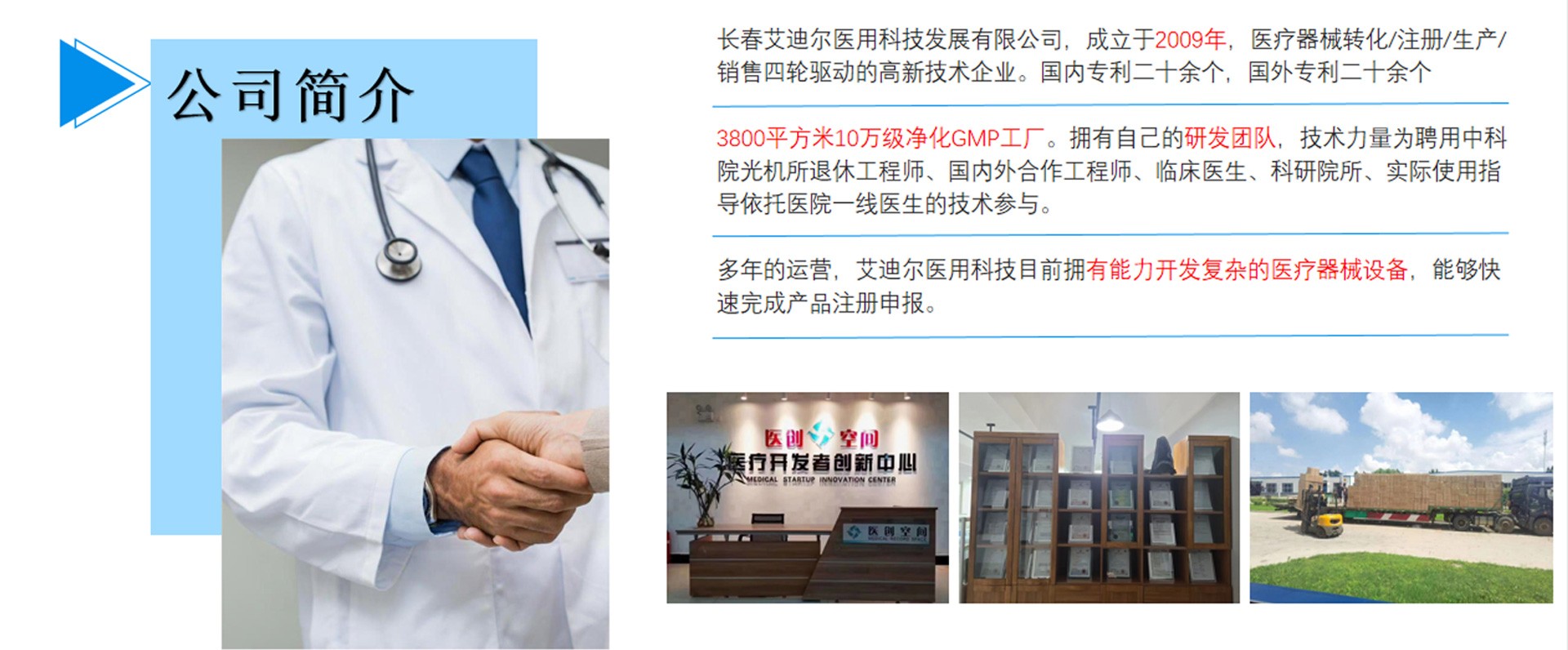長春艾迪爾醫(yī)用科技發(fā)展有限公司為集產(chǎn)(自有工廠); 學(多所院校科研課題合作單位);研(研發(fā)成果轉化注冊)三位一體的高新技術企業(yè)。艾迪爾科技主要經(jīng)營范圍為一次性醫(yī)療器械耗材的開發(fā),專注于抗菌肽新材料的開發(fā)和研制,以“IN-58抗菌肽一類新藥及原料藥注冊、激光類治療儀”兩個核心優(yōu)勢技術為中心。公司擁有標準GMP車間及健全的質(zhì)量管理體系,擁有多個已上市和即將上市的產(chǎn)品,包括睡眠、泌尿、口腔、肝膽、消殺、婦科六大系列產(chǎn)品線。公司擁有核心專業(yè)技術報批團隊,承接國內(nèi)外醫(yī)療器械專項成果轉化,具備自主研發(fā)能力及MAH服務能力。
